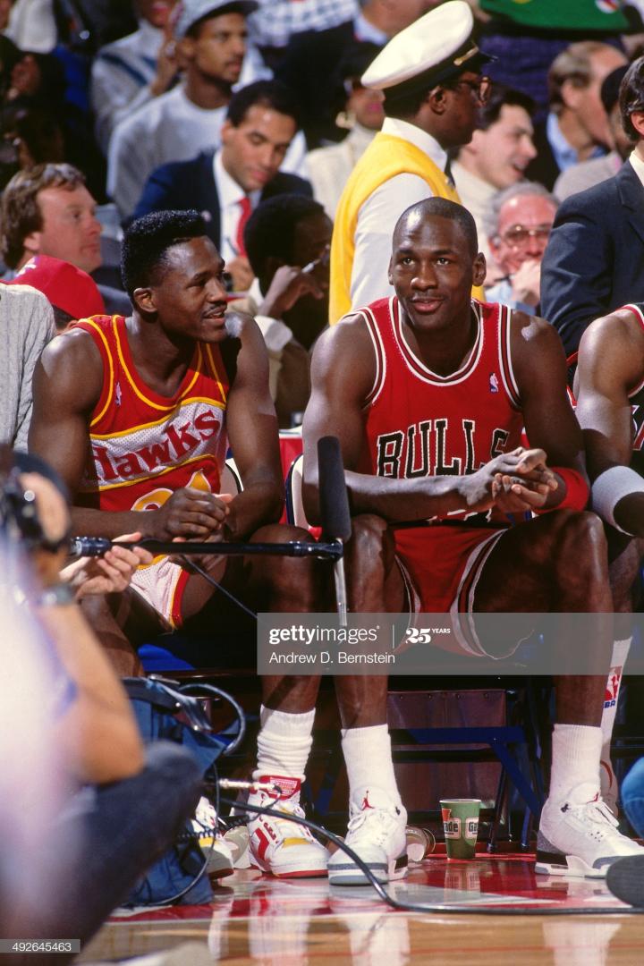 在上世纪80、90年代,“人类电影精华”威尔金斯是乔丹的“劲敌”之一。这并非是说二人在季后赛多次相遇(他俩只遇到过一次),而是因为二人得分能力都很劲爆,威尔金斯也是为数不多的,在生涯对位乔丹的比赛中场均得分达到30+的球员。若考虑到他俩的生涯成就,乔丹和威尔金斯的对决,不像是科比VS詹姆斯,倒像是科比VS麦迪。