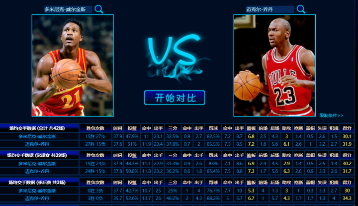 据统计,乔丹和威尔金斯在常规赛中交手39场,乔丹27胜15负占据上风。乔丹场均得到31.9分7.2个篮板6.1次助攻2.6次抢断,命中率51%;威尔金斯则场均得到30.1分6.8个篮板3次助攻1.4次抢断,命中率47.9%。
