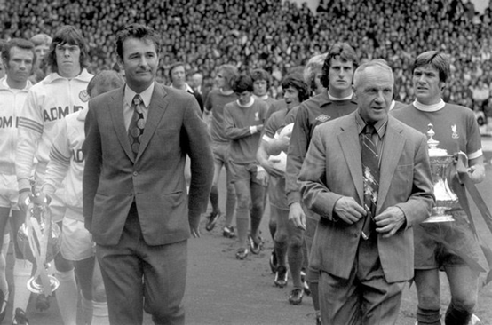 (1974-75赛季社区盾杯开幕式,联赛冠军利兹联对阵足总杯冠军利物浦。两位继任者:克拉夫和佩斯利,在未来分别将球队带往了不同的方向)
