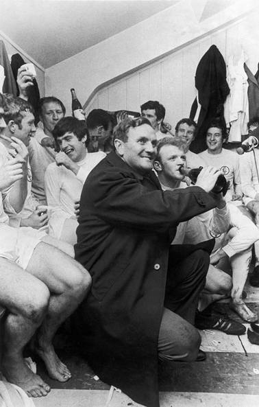 (唐-里维和他的“爱子”们在安菲尔德球场更衣室庆祝联赛夺冠)