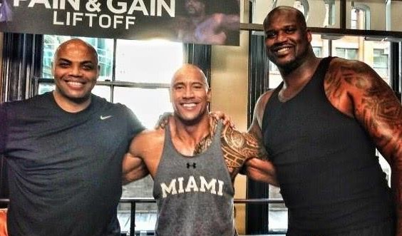 强森本来这身材,在普通人里是相当自信,但是当他遇到奥尼尔和巴克利,他瞬间是显得小鸟依人。巴克利也就比强森高了5cm,但是身体宽度根本不是一个级别,更别说身边还有奥尼尔这样的怪物。强森夹在两人中间,那也是一脸无奈强颜欢笑。