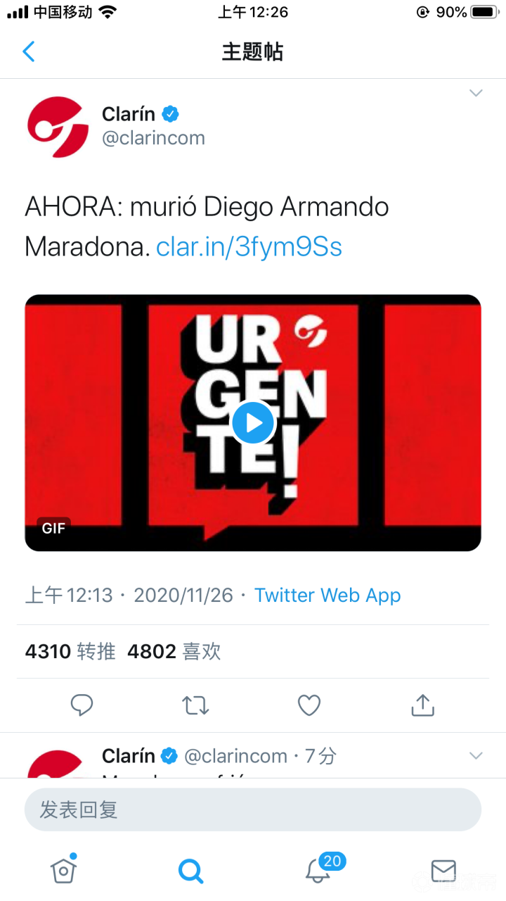 Clarin,阿根廷号角报,为阿根廷国内最权威的...西野家的247 @懂球帝2020-11-26 00:30Clarin,阿根廷号角报,为阿根廷国内最权威的报纸之一,其地位类似我国的人民日报。随后多家外媒也确认其消息源正确。 安息吧,一代球王马拉多纳。展开更多