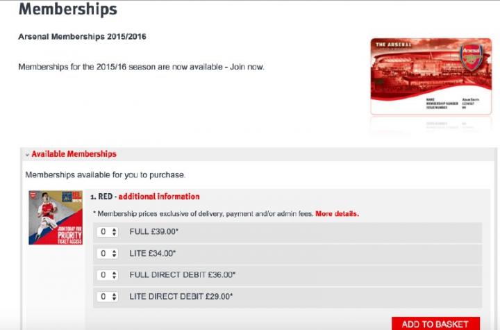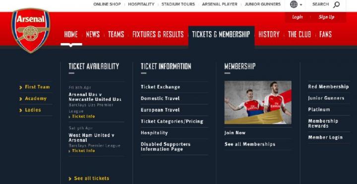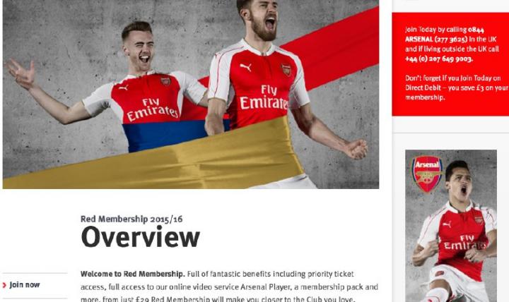进入阿森纳官网,上方菜单栏的“TICKETS&MEMBERSHIP”就是票务和会员,下拉菜单可以看到“MEMBERSHIP”里有“Join Now”,点击它。
