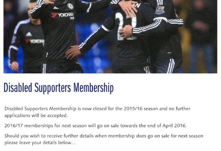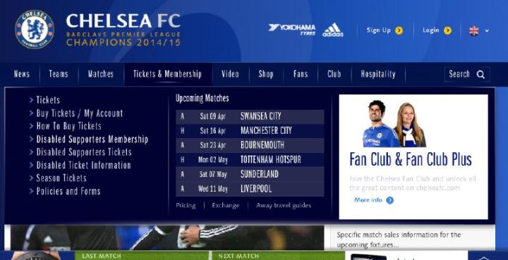 切尔西官网首页菜单栏同样有“Tickets&Membership”,光标移动到这里就能看到选项,不但有Tickets的选项,还有专门为残疾球迷设立的Disabled Tickets通道……俱乐部的关怀确实细致入微。