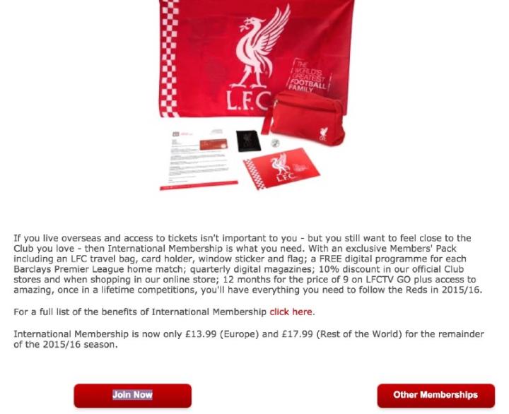 作为外国球迷,相信大家更关注国际会员。国际会员价格优惠(17.99英镑),主要权益包括利物浦英超主场比赛的网络直播观看,利物浦商城消费9折优惠,利物浦电视台折扣以及一个如下图所示的礼包。