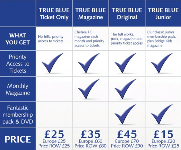好吧,为了切尔西球迷看到这里不会点举报,我查找到了过去切尔西会员的权益。主要包括三项:主场球票优先购买权;切尔西队刊;会员包&DVD。会员费英国地区是45英镑,欧洲是70英镑,世界其他地区竟然高达90英镑。