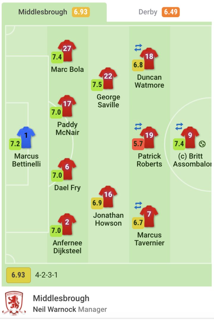 米德尔斯堡首发球员:1-贝蒂内利 2-迪克斯特尔 6-弗莱 17-麦克奈尔 27-马可博拉 16-豪森 22-乔治·萨维尔 7-塔维尼耶 19-罗伯茨 18-沃特莫尔 9-阿松巴隆加