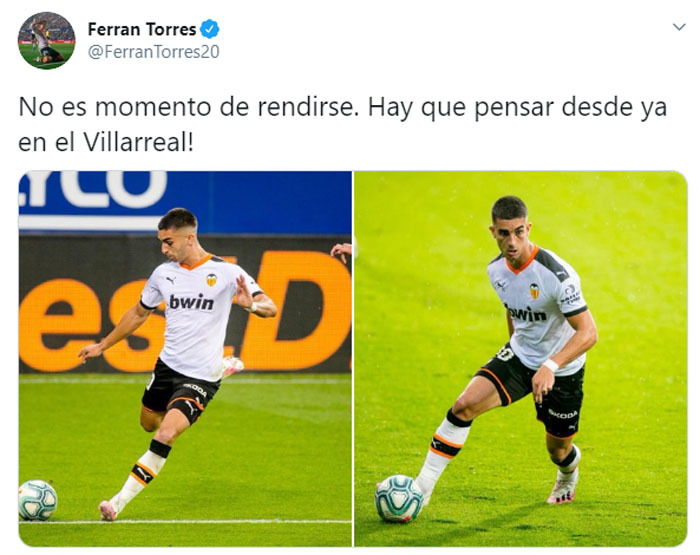 Ahora no queda otra que pelear a tope en LaLiga para volver a la Champions. pic.twitter.com/N0vIR0jQKq— Ferran Torres (@FerranTorres20) March 11, 2020