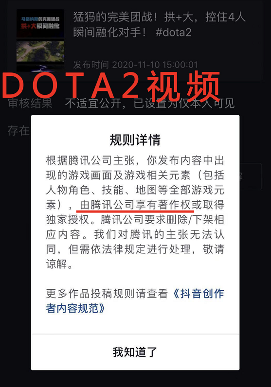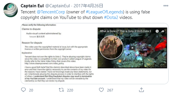腾讯( 英雄联盟拥有者 )利用错误的版权在油管上申诉下架 DOTA2 视频▼