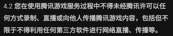 点进去之后可以看到在 4.2 条款中,明确说明玩家不得在未经腾讯许可的情况下录制、直播或者传播游戏内容。