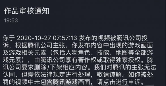 这位博主在抖音上拥有几十万粉丝,之前的视频都没出过什么问题,这次的视频也只是个正常的游戏精彩操作集锦,怎么就被举报了?于是他看了一下举报方,发现居然是腾讯举报的。。。