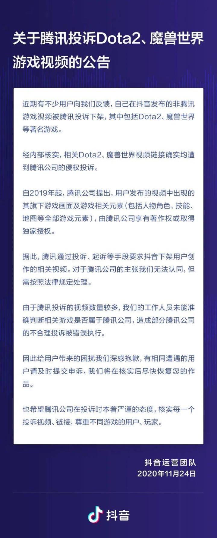 所有人都在等待一个解释,终于在今天凌晨,抖音官方发布了一条公告,对于大范围下架 DOTA2、魔兽世界相关视频的事情进行了解释。