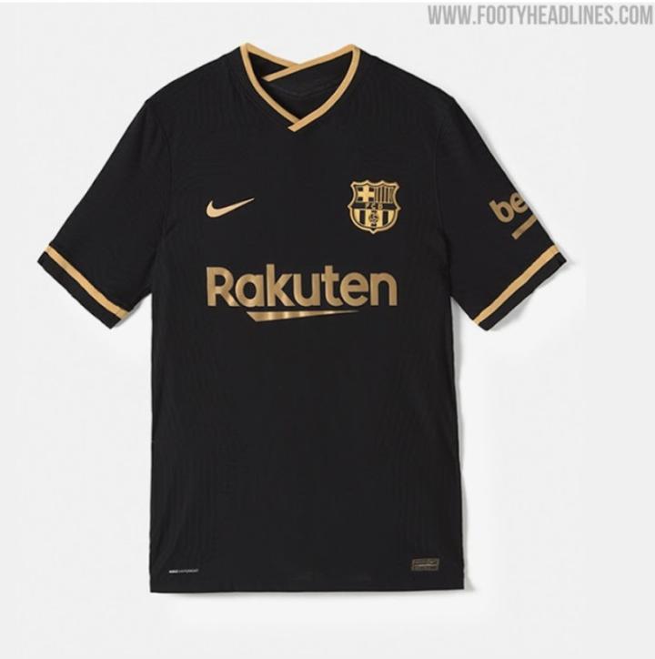 耐克20-21赛季巴萨客场球衣以黑色为主色调,搭配金属金的队徽和logo设计,球衣的领口和袖口也是金色设计。