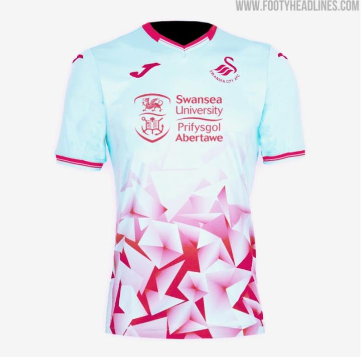 斯旺西20-21赛季客场球衣以耀眼的蓝绿色和粉色渐变搭配,球衣前方装饰了立体的几何图案。