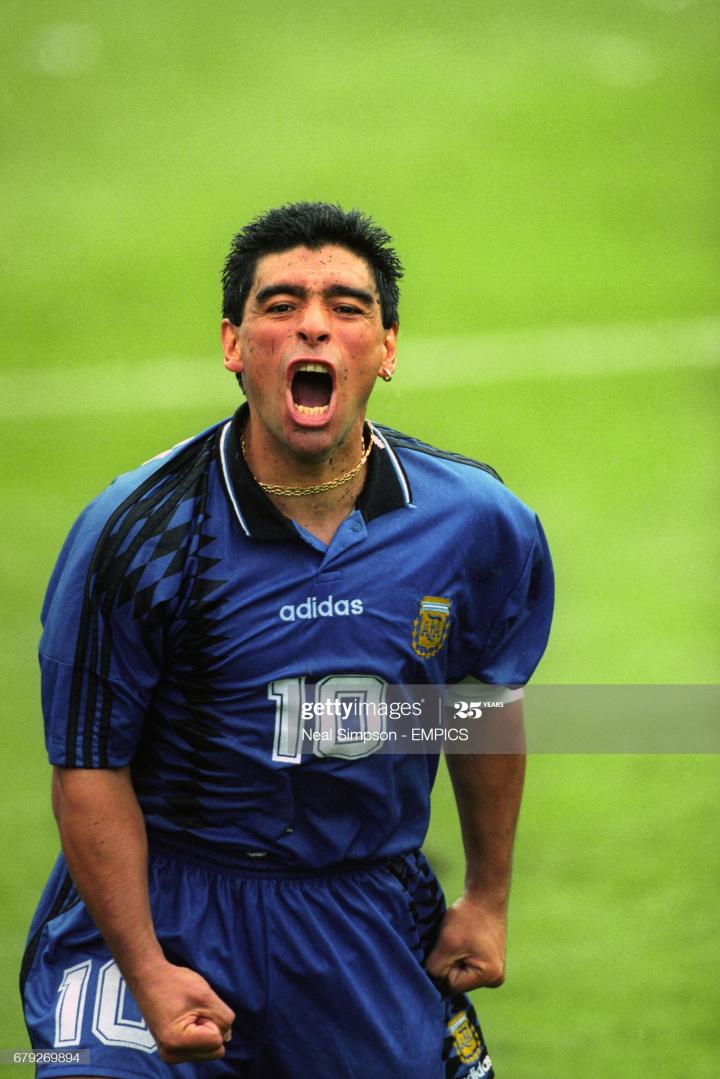 1994年美国世界杯,马拉多纳只是参加了前两场比赛,后因尿检呈阳性而被禁赛,他在这届世界杯一传一射,特别是在对阵希腊的世界波破门后,冲到边线对着摄影机表情爆裂地怒吼的画面,依旧深深印刻在老一辈球迷的记忆里。
