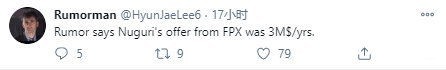 爆料人:FPX给Nuguri报价每年300万美金,与Swordart薪资一样buddj2020-11-28 17:01外媒爆料人:FPX给Nuguri的报价是每年300万美金,与Swordart薪资一样。11月27日,TSM官方:前SN辅助SwordArt加盟,年薪据传高达300万美元。SwordArt现年23岁,出道于闪电狼,在18年加盟SN,随队获得了S10世界赛亚军的成绩。据美媒报道,他和TSM签署了2年600万美金的合同。展开更多