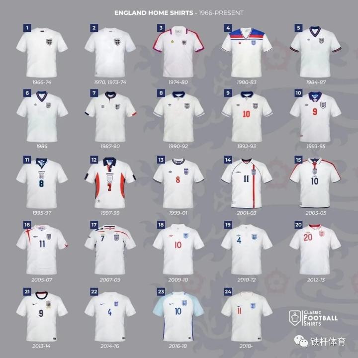 现代足球历史中,球衣就如同年轮一般,见证了岁月中的种种故事。下图中白色球衣是英格兰国家队的第一代传统意义上球衣,在此之前他们的队服就是白色衬衣上面绣一个队徽。