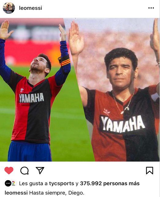 除了进球之外,梅西在赛后发布了一条让人泪崩的Instagram。在自己的Instagram,梅西这样配上了自己进球后的照片和马拉多纳在老男孩首秀的照片并写道:“永别了,迭戈。”