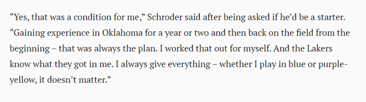 “是的,那是我的一个条件,”当被问及是否会成为湖人首发时,施罗德直言不讳,“我已经在俄克拉荷马城获得了一两年的经验,现在会重新回到起点(打首发),那一直是我的计划……湖人知道他们能从我身上得到什么,我总是付出全部,无论穿的是蓝色还是紫金。”施罗德还表示,自己在詹姆斯身边打球,詹姆斯就不用在场上考虑太多的问题。生涯至今,施罗德打了496场常规赛,其中177场是首发出场。