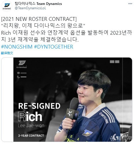 Rich选手曾效力于GEN.G战队,主玩中单,于2019年转会至DYN战队并转型为上单,此次续约,Rich选手的合约到期时间由2021年延长至2023年。