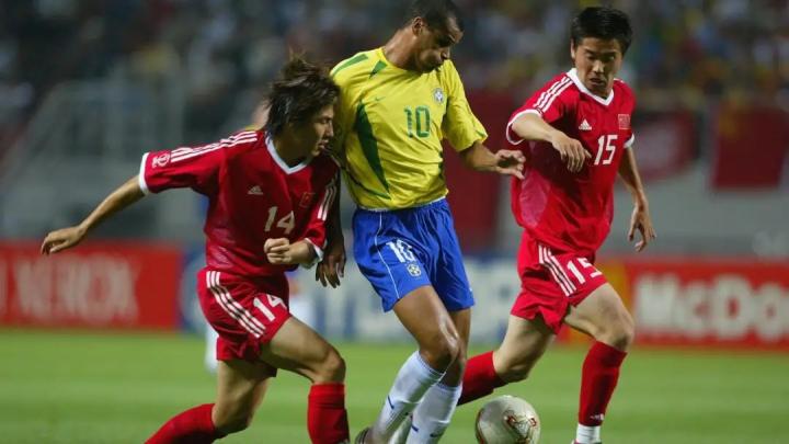 曾在意甲佩鲁贾队效力的马明宇在上半场浪费了禁区内的射门机会。随后,中国队后卫在禁区内拉倒了罗纳尔多,罗纳尔迪尼奥操刀将点球罚入。下半场开场不久,罗纳尔多接卡福传球锦上添花,巴西4:0领先。但是,中国队并未放弃,肇俊哲用很漂亮的盘带晃过了卢西奥,但射门打在远门柱上飞出,中国队差一点儿打入在世界杯上的第一球,另外,替补出场的邵佳一也有一记不错的任意球很有威胁。