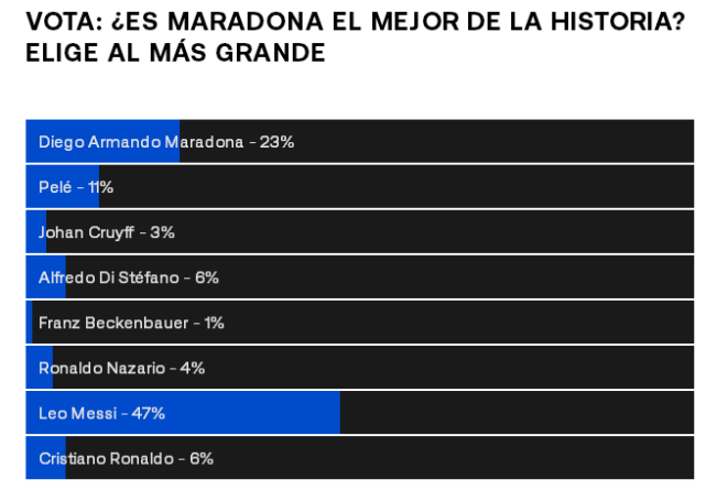 梅西以46%的得票率高居榜首,比排名第二位的马拉多纳(23%)多出了一倍,球王贝利则仅得到了11%的投票。除了这5名球员之外,罗纳尔多(4%)、克鲁伊夫(3%)和贝肯鲍尔(1%)分居其后。