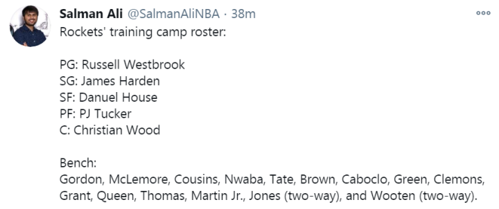 另一位火箭记者Ali列出了火箭的20人训练营名单——