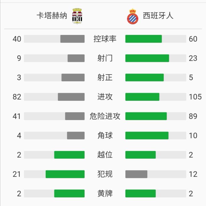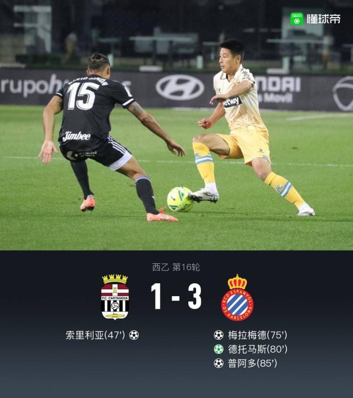 全场比赛结束,西班牙人客场3-1逆转卡塔赫纳。