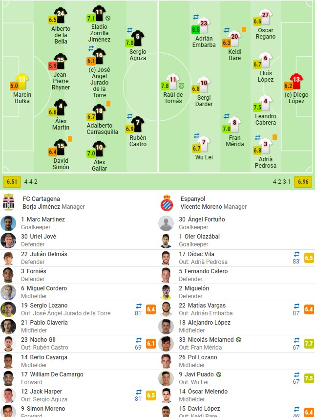 卡塔赫纳首发:13-布尔卡、15-戴维-西蒙、4-亚历克斯-马丁、25-里纳、24-德拉贝利亚、5-阿古扎(81`12-哈珀)、16-托雷(81`19-塞尔希奥-洛萨诺)、18-卡拉斯基利亚、10-加利亚尔、11-索里利亚、7-鲁文-卡斯特罗(69`23-纳乔-希尔)