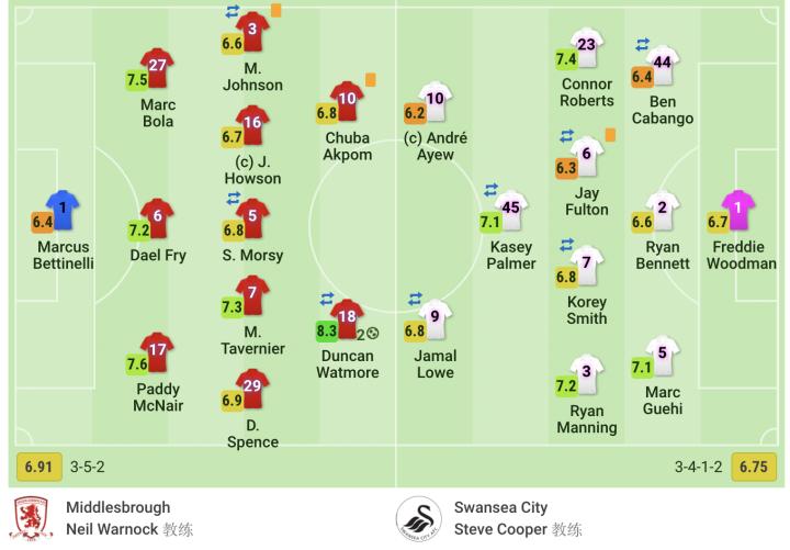 斯旺西首发阵容:弗雷迪·伍德曼;本·卡班戈(韦恩·鲁特利奇 46min),瑞安·贝内特,马克·盖希;康纳·罗伯茨,科雷·史密斯(乔登·加里克 81min),杰伊·富尔顿(马特·格里姆斯 46min),瑞安·曼宁;卡西·帕尔默(扬·丹达 65min);安德烈·阿尤(C)、贾马尔·洛(维克多·乔格雷斯 46min)