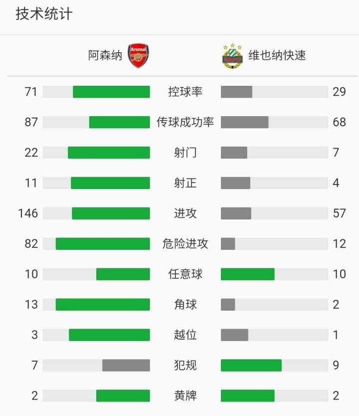 阿森纳4-1维也纳快速豪取小组赛五连胜,枪手4将取得进球