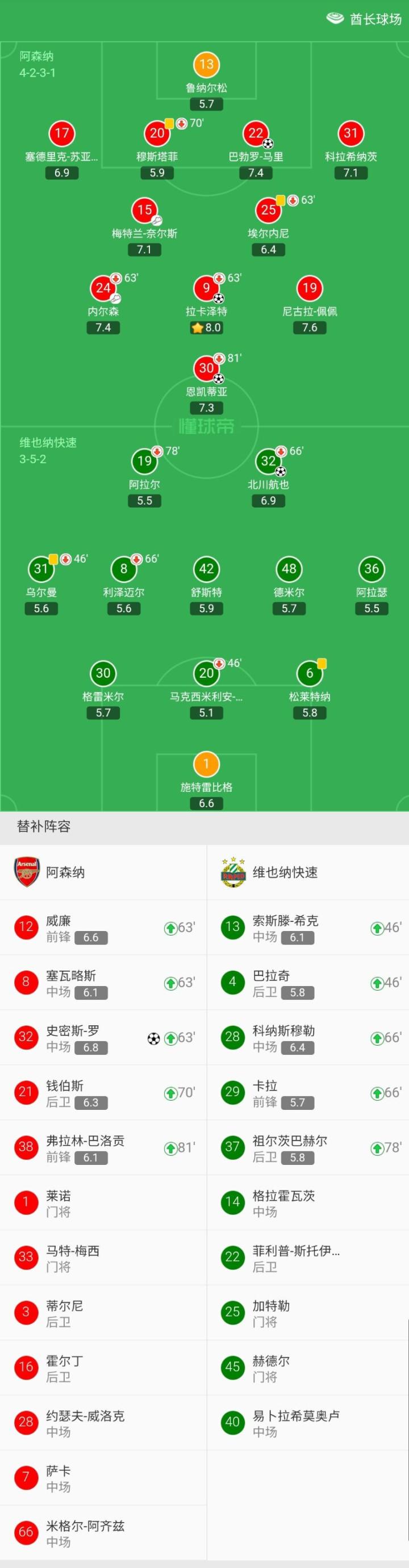 阿森纳首发:13-鲁纳尔松、20-穆斯塔菲(70'24-钱伯斯)、17-塞德里克-苏亚雷斯、22-马里、31-科拉希纳茨、15-梅特兰-奈尔森、25-埃尔内尼(63'04-塞瓦略斯)、24-内尔森(63'04-威廉)、9-拉卡泽特(63'04-史密斯-罗)、19-佩佩、30-恩凯蒂亚(81'56-巴洛贡)