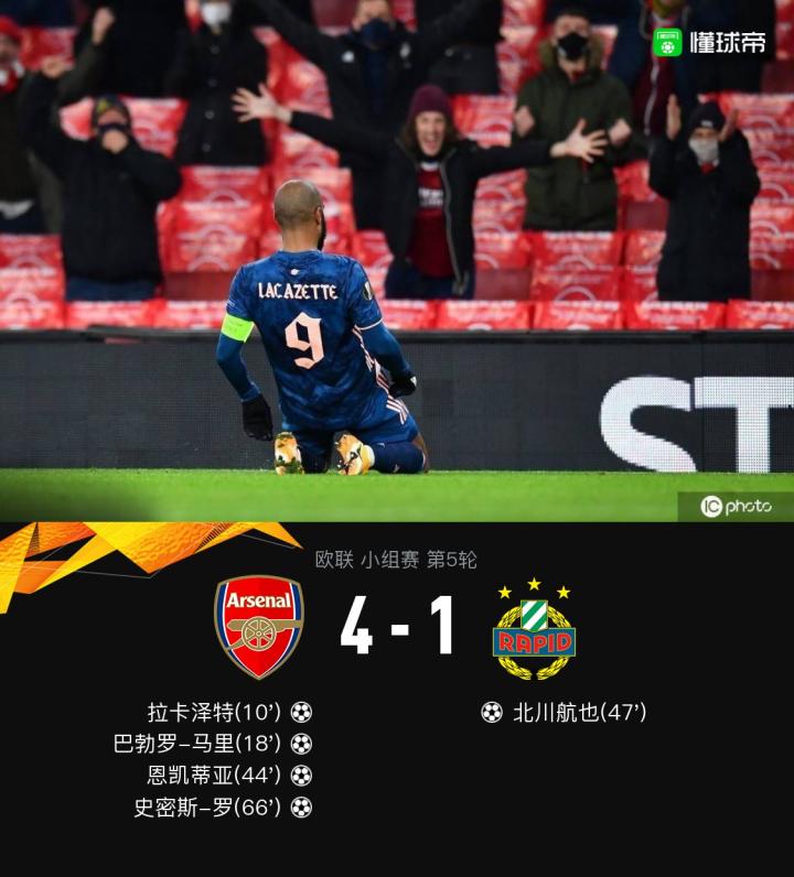 北京时间12月04日04:00,欧联小组赛B组第5轮的一场比赛,阿森纳主场对阵维也纳快速,上半场拉卡泽特世界波破门首开记录,马里利用角球机会头球再下一城,随后拉卡泽特外围推射击中立柱,恩凯蒂亚补射扩大比分。下半场开场不久北川航也扳回一个,史密斯-罗替补破门再进一球,最终阿森纳4-1维也纳快速。