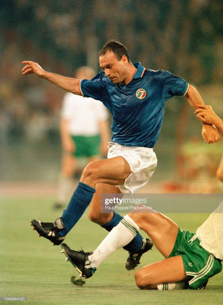 1990年世界杯的金靴奖是一战成名的斯基拉奇,他在世界杯使用的球鞋是意大利品牌kronos的,斯基拉奇和罗西风格很像,他在莫西拿拿到意乙金靴后被尤文图斯签下,他首次入选国家队是1990年3月,他也是最后一位被招入1990年世界杯大名单的意大利球员。当时是维亚利、卡内瓦莱、曼奇尼和塞雷纳之后的第五号前锋,结果就是这样一个替补中的替补,在对阵奥地利队时替补上场打破僵局,此后一发不可收,最终打入6球,成为世界杯金靴和金球奖得主。但一年后,斯基拉奇就因为被伦蒂尼他带了戴帽子而一蹶不振。