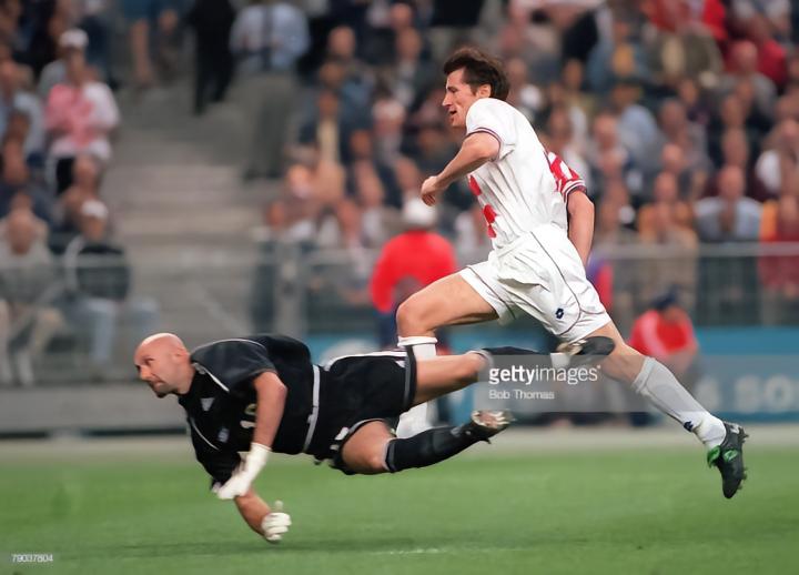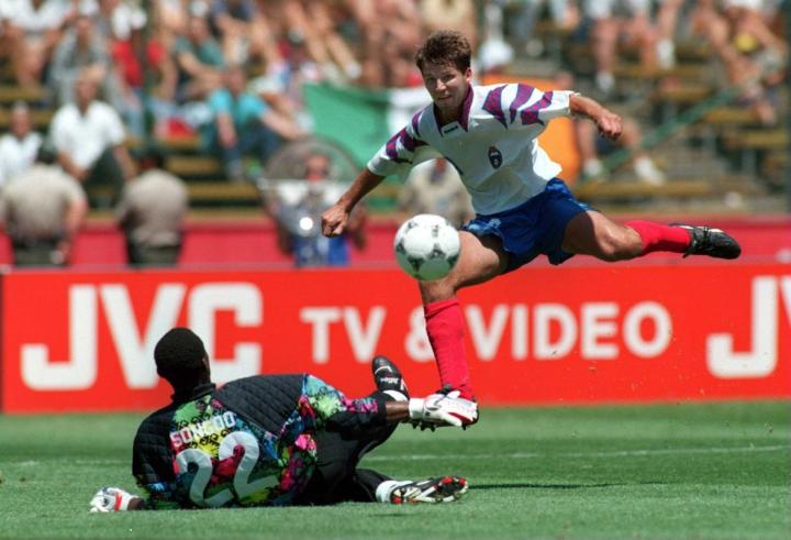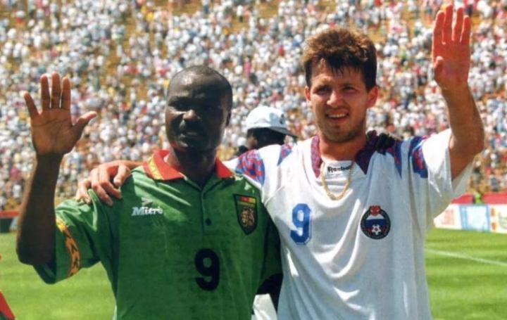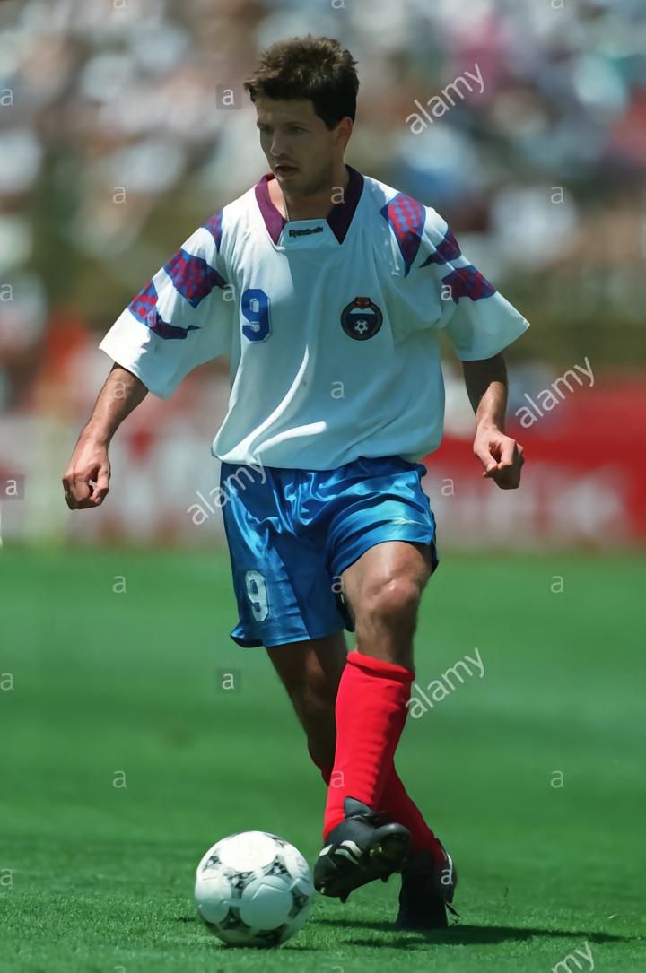 另一位是来自俄罗斯的爆发户萨连科,他在和喀麦隆的比赛中独中五元,不过他在和瑞典队的小组赛中也打入一球,虽然俄罗斯小组赛和非洲雄狮一起出局,最终以三场比赛六个进球和斯托伊奇科夫分享了1994年世界杯金靴奖。当时的俄罗斯队是reebok赞助的球队,萨连科效力于西甲弱旅洛格罗尼奥,所以他穿的球鞋就是锐步的第一款足球鞋1993年的integrity。