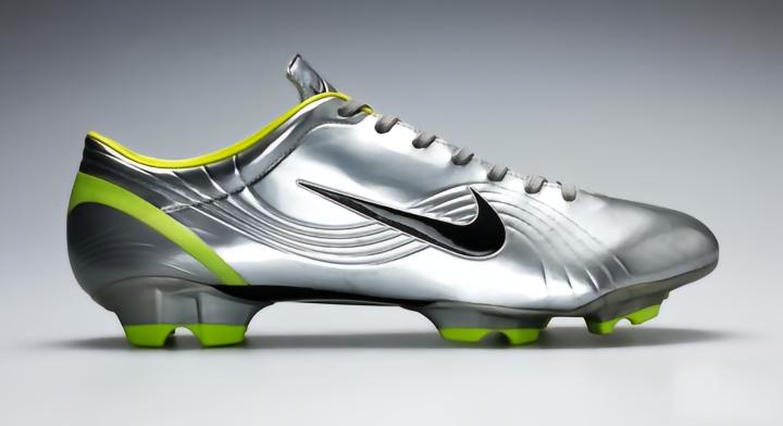 2002年世界杯就不用多介绍,外星人罗纳尔多,他在那届世界打入8个进球,并且最终获得世界杯冠军,表现令人惊叹。大罗在1998年世界杯屈居亚军,此后经历严重的伤病,身体状态可以说大不如前,但是2002年世界杯的外星人依旧无人能敌。nike公司也在当年为罗纳尔多推出了全新的刺客系列足球鞋,罗纳尔多使用的是银绿配色的限量本版,全球限量4600双。这款鞋也是大罗巅峰战靴,和它一样经典的只有罗纳尔多的阿福头了。