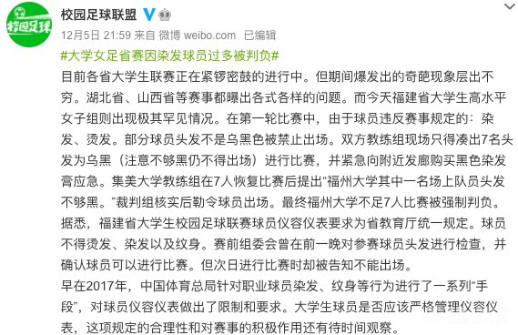 博主“校园足球联盟”微博爆料,福建省大学生高水平女子组出现了极其罕见的情况,因染发球员过多该队被判负。
