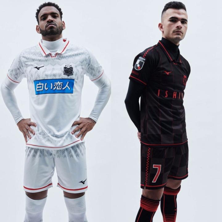 客场球衣则采用低调时髦的黑色设计,衣领与袖口加入醒目的红色细纹,并且俱乐部徽章、Runbird标识以及胸前广告等也采用色彩反差强烈的红色设计。第二客场球衣则以白色为主色,球衣上加入展现北海道当地文化与冰雪特色的纹饰细节,优雅复古的翻领与袖口同样加入红色细纹装饰。