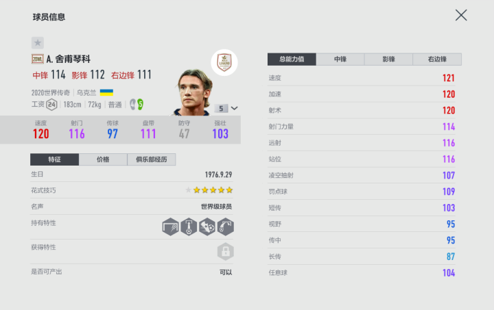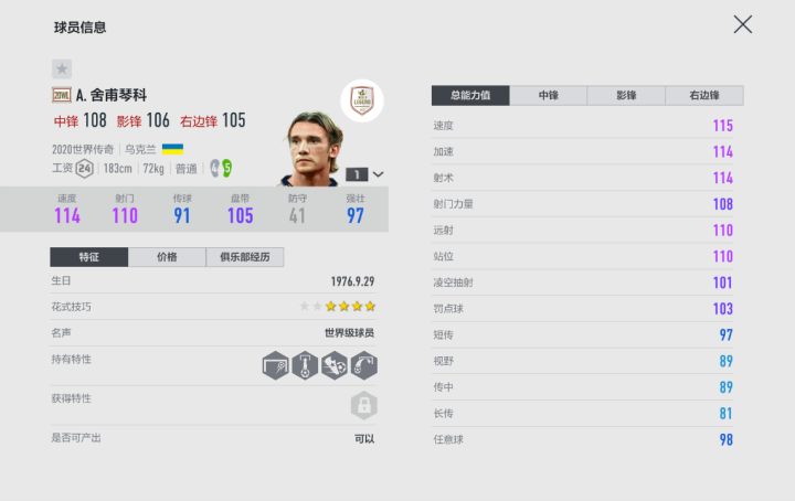 舍甫琴科之所以被称为“乌克兰核弹头”,就是因为其强大的破坏力,作为当时最顶级且全面的射手,舍瓦几乎没有短板。在游戏内,20WL赛季的舍甫琴科目前最为强悍,他拥有傲视群雄的双速度,初始值就在115上下,还有恐怖的得分能力,无论是远射还是头球都是他的拿手本领,配上不俗的盘带水平,使得这张球员卡变得异常强大。