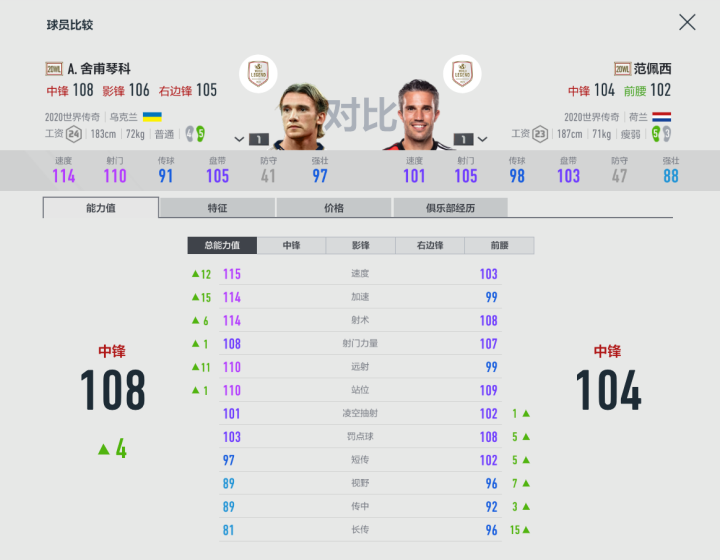 舍瓦的特点之一,就是其飞快的速度,他往往凭借自身惊人的爆发力就能觅得破门的机会。对比同是20WL赛季的范佩西就可以感受到舍甫琴科的强大,舍瓦在速度属性方面领先了12点,加速度方面则一下子拉开到了15点,再结合其强壮的身体,又能扛速度还快,“乌克兰核弹头”无疑是所有后卫的噩梦。