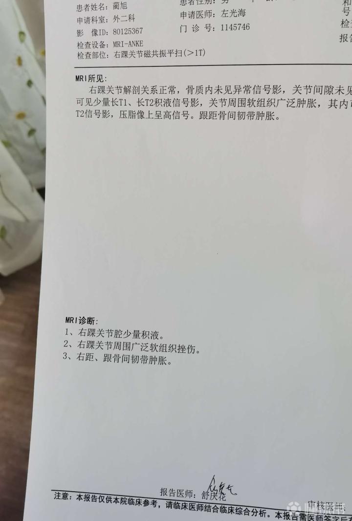 兄弟萌三周前踢球右脚脚踝狠狠的扭了一下,然后当晚...Blackstorm @懂球帝2020-12-08 19:54兄弟萌三周前踢球右脚脚踝狠狠的扭了一下,然后当晚就去医院照了ct然后医生说骨头没什么事,一周后去照了核磁共振然后下图是核磁共振报告脚反正很肿,医生也说没啥大问题叫我少走动,之后包了两次中药明显消了很多肿,但现在三个周了还是不能跑动,跑的时候内踝特别疼,走路倒是没啥问题了,我这种情况严重吗,懂的的地帮我看看还有多久能好,太tm想踢球了[流泪狗头]展开更多