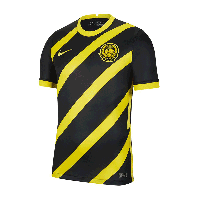 全新客场球衣则以黑色为主色,球衣正面加入受到马来西亚国旗启发的五条黄色斜纹,同时衣领、袖口以及身体两侧的透气条带也加入黄色点缀。虽然加入了灵感源自国旗的条纹图案,但这件全新客场球衣却没有使用以往客场球衣惯用的蓝、白、红三色。