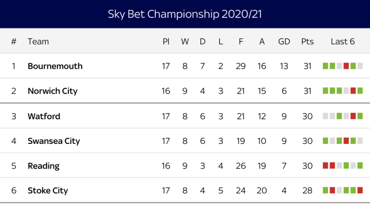 可是,不知从何开始,黑马们的状态大有反弹之势,传统豪强们也在悄无声息间来到了积分榜前列。雷丁最近近5轮联赛不胜(4负1平)后排名来到了第五位,这支英超球队自09/10赛季降级英冠后的12个赛季里还从没有出现过5连败,这次可以说是完完全全的追平了球队的历史。短暂登顶的埃弗顿也慢慢的退出了积分榜前列,取而代之的还是热刺、利物浦和切尔西;那些刚刚从英超降级的爸爸们也很快把积分榜前三席给瓜分干净。英冠联赛的积分榜也早已被伯恩茅斯、诺维奇、沃特福德占领。