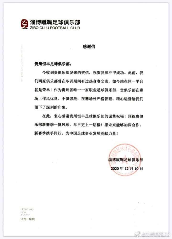 随着球队的冲甲成功,淄博蹴鞠足球俱乐部官方发布了多封感谢信,感谢多家俱乐部对球队的关注与支持。
