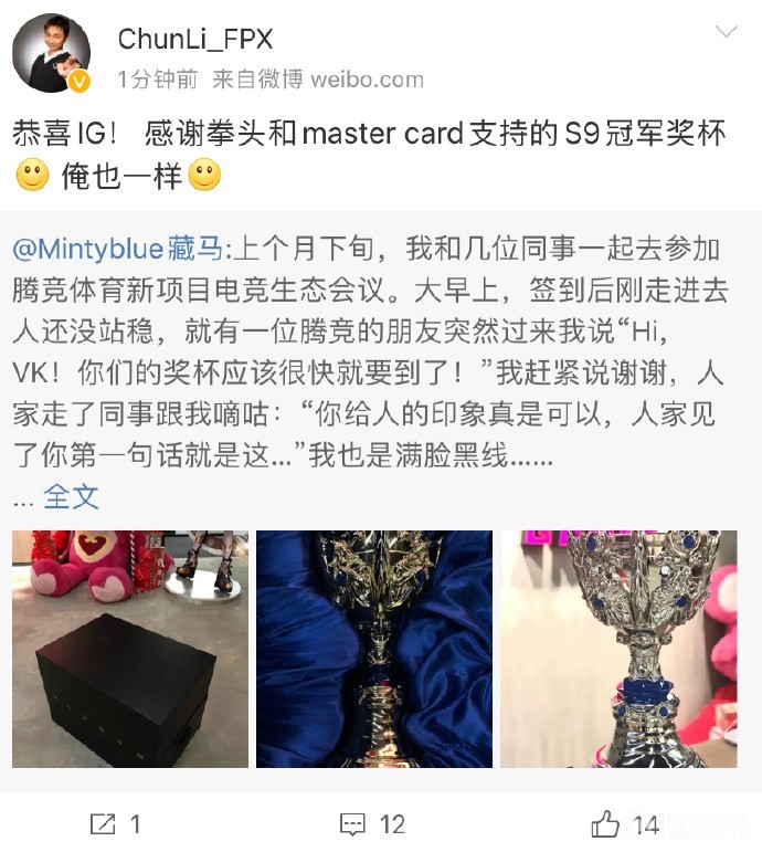 今日藏马发博,表示拳头的S8冠军纪念奖杯已经送到基地,并且晒出图片庆祝。
