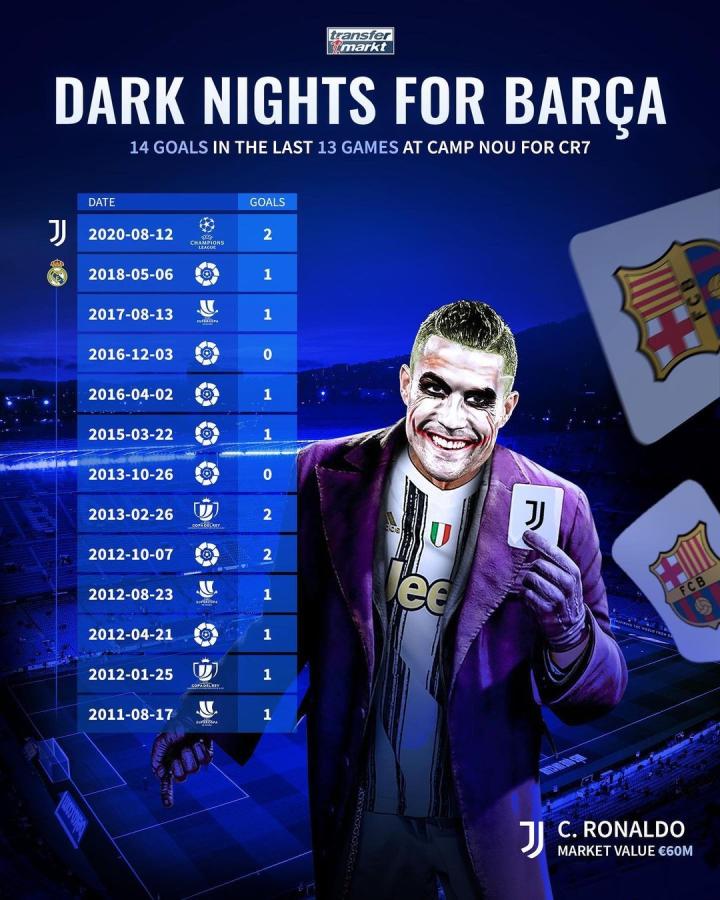 在欧冠小组赛最后一轮比赛中,尤文客场3-0战胜巴萨,C罗在本场比赛中梅开二度。赛后,据德国转会市场网站的统计,最近13场在诺坎普对阵巴萨时,C罗一共打进了14球,效率堪称恐怖。