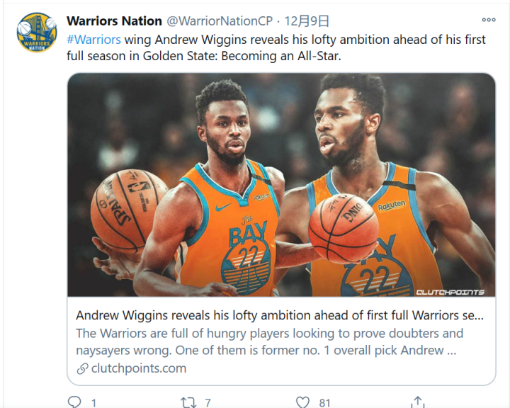 近日在接受采访时,谈到自己下赛季在勇士的目标,维金斯直言他想成为全明星,并称这是他一直以来的目标之一,还有一个则是为一支能赢球的球队效力,这个目标如今已算初步达到了。