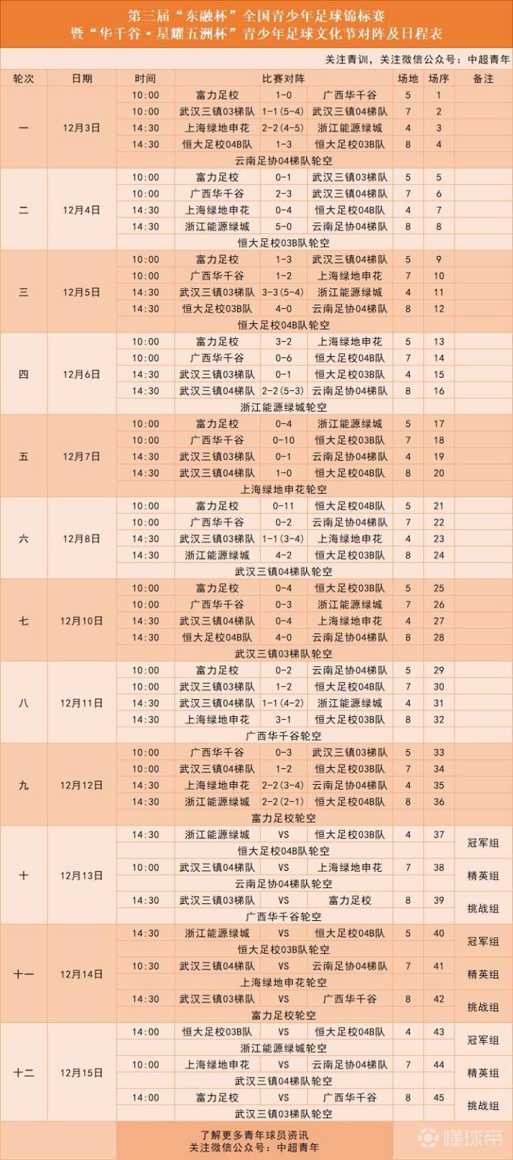 【“东融杯”U17邀请赛战报:绿城、恒大03B、恒大04B三队进入冠军组】 12月12日,第三届“东融杯”全国青少年足球锦标赛展开了第九轮的较量,浙江能源绿城点球战胜恒大足校04B队,以小组第一的身份与恒大足校04B队、恒大足校03B队共同进入冠军组! 第二阶段分组: 冠军组:浙江能源绿城、恒大足校03B队、恒大足校04B队 精英组:武汉三镇04梯队、上海绿地申花、云南足协04梯队 挑战组:武汉三镇03梯队、富力足校、广西华千谷 各场次比分如下: 武汉三镇04梯队 1-2 恒大足校03B队 进球队员:赵磊/韩佳明、黄梓轩 上海绿地申花 2-2(3-4)云南足协04梯队 进球队员:杜亿民、刘洋/王绍锐、李辕 浙江能源绿城 2-2(2-1)恒大足校04B队 进球队员:黄楠、麻皓齐/饶文、徐智诚