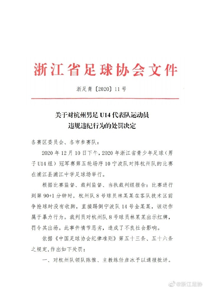 【浙江足协公布U14球员暴力飞踹事件处罚结果:球员停赛一年】