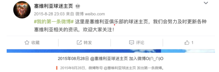 2015年8月28日,“塞维利亚球迷主页”加入微博,这是微博上最早开始定期专门更新塞维利亚足球俱乐部相关新闻的账号。我们这支来自西班牙安达卢西亚的球队,也得以在微博平台上逐渐走进广大球迷的视野。